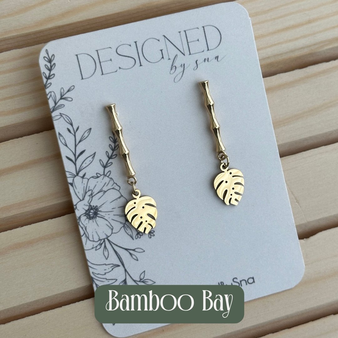 -Channel sunny island days with the Bamboo Bay earrings. The textured bamboo-inspired post feels like a little piece of paradise, paired with a charming dangling Monstera leaf that dances like a gentle ocean breeze. Cute, tropical, and light.